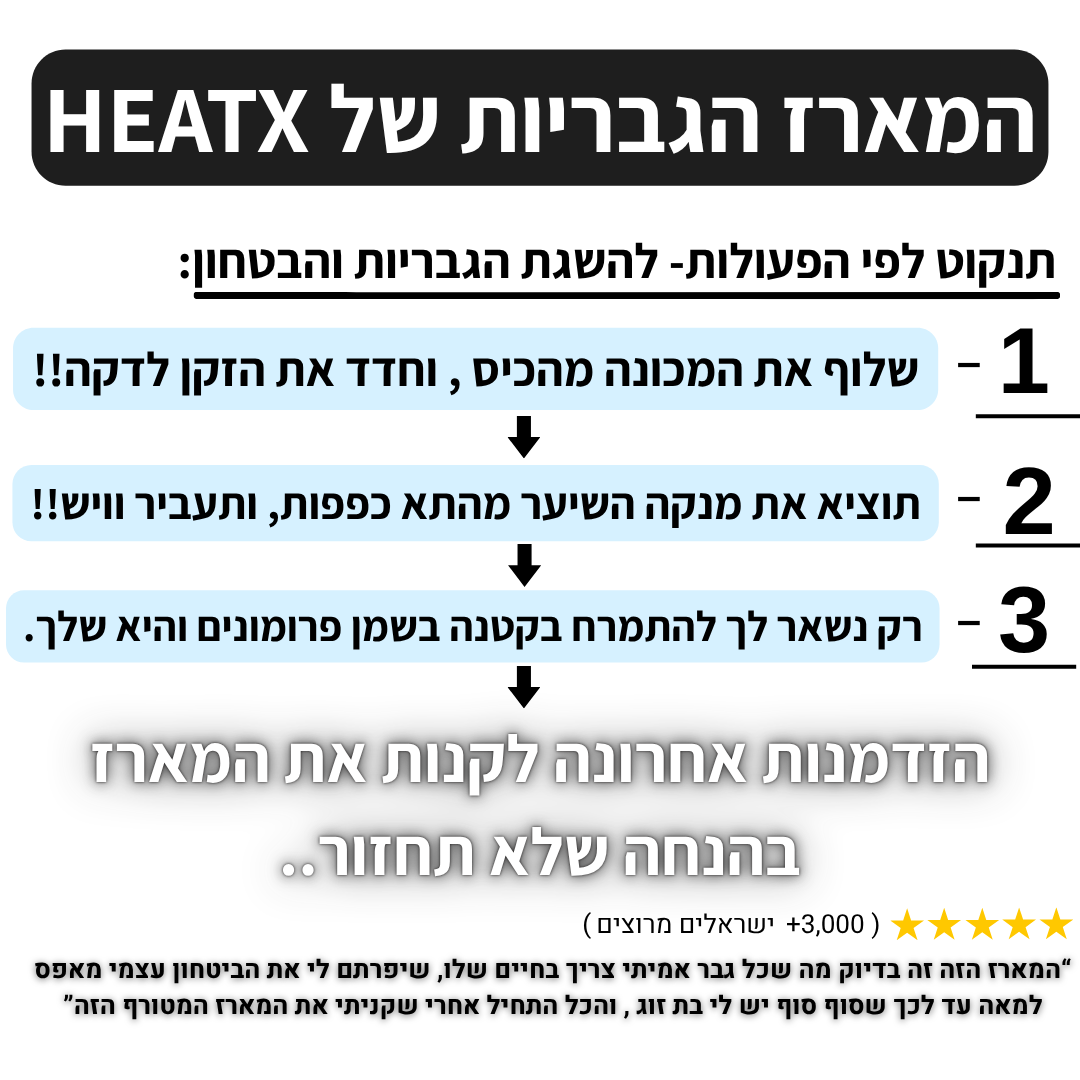 כדי שנוכל להציע לכם את HeatX במחיר המשתלם ביותר, בחרנו כרגע להתמקד במכירה אונליין בלבד. זה מאפשר לנו לחסוך בעלויות תפעול ושכירות, ולגלגל את החיסכון הזה אליכם.
